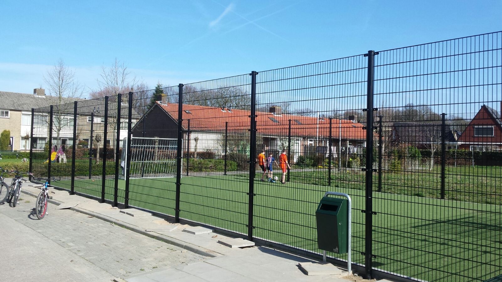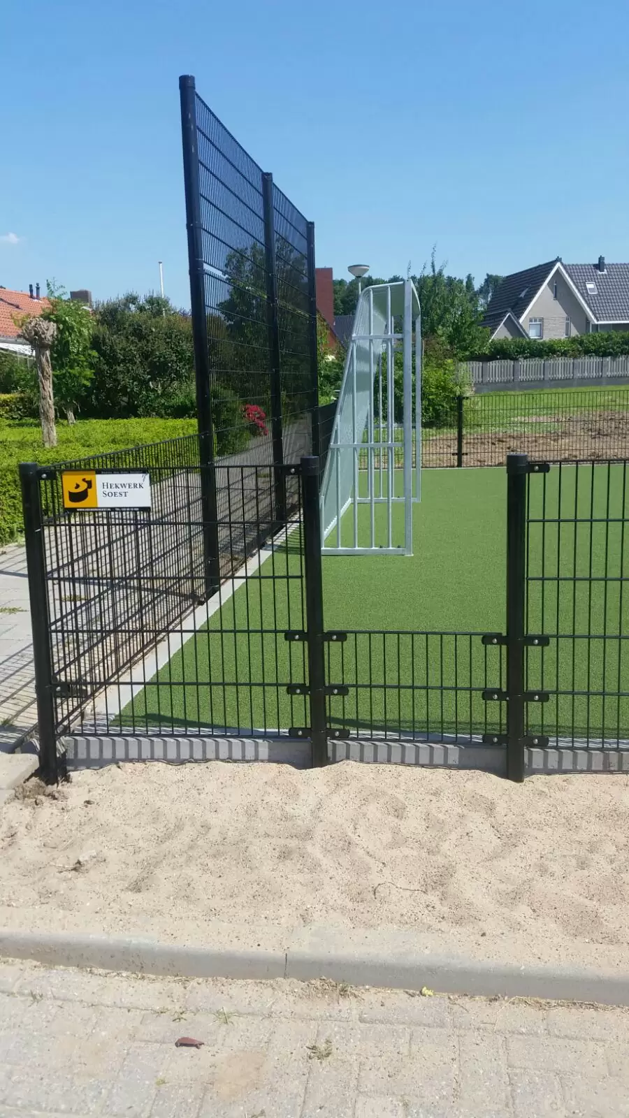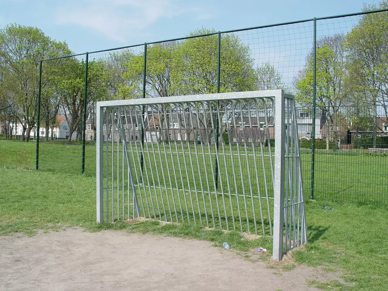 Professionele, geluidsarme ballenvanger inclusief interieur. Hoog hekwerk bij een speelveld, meestal langs een deel van het terrein.