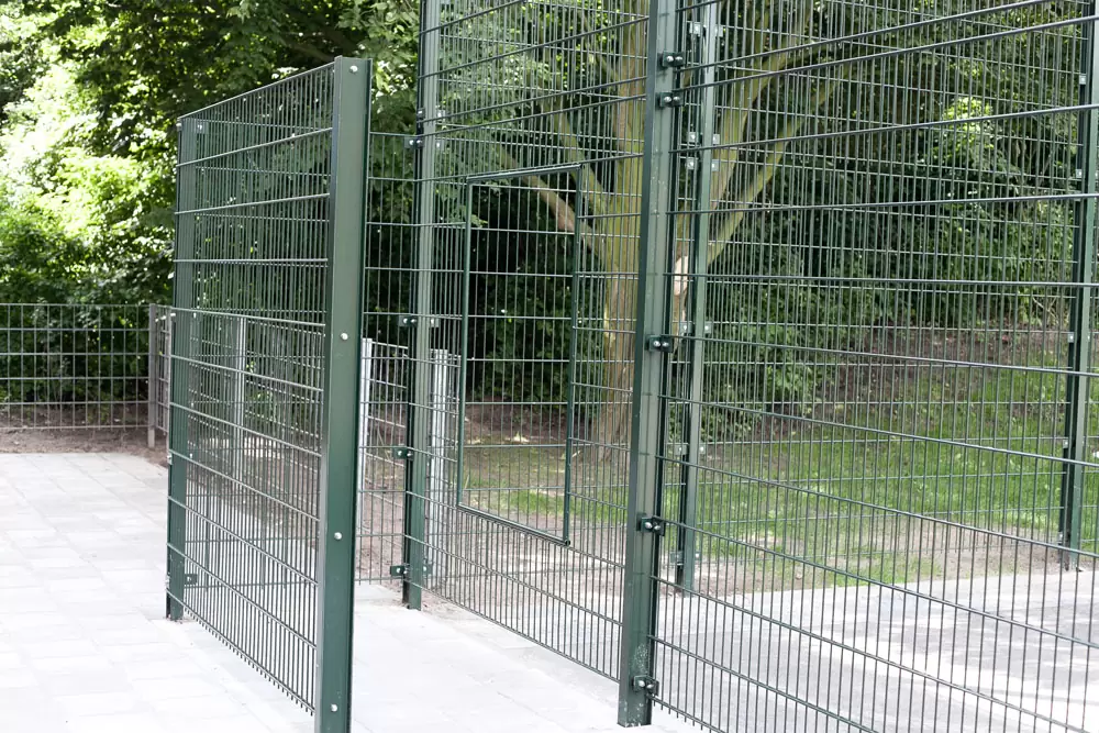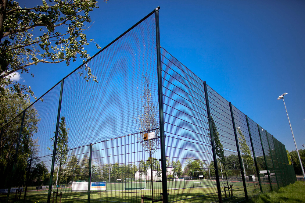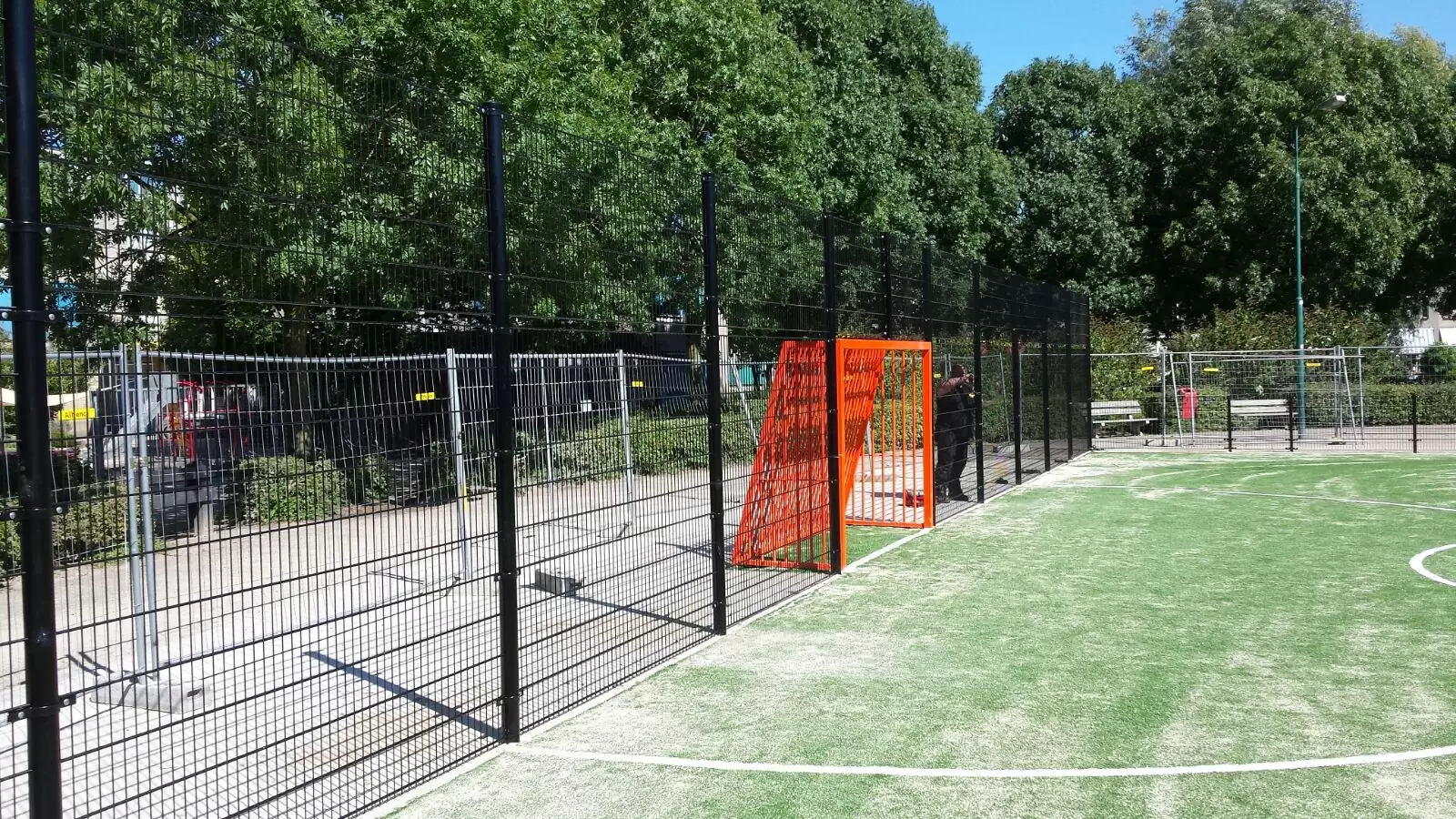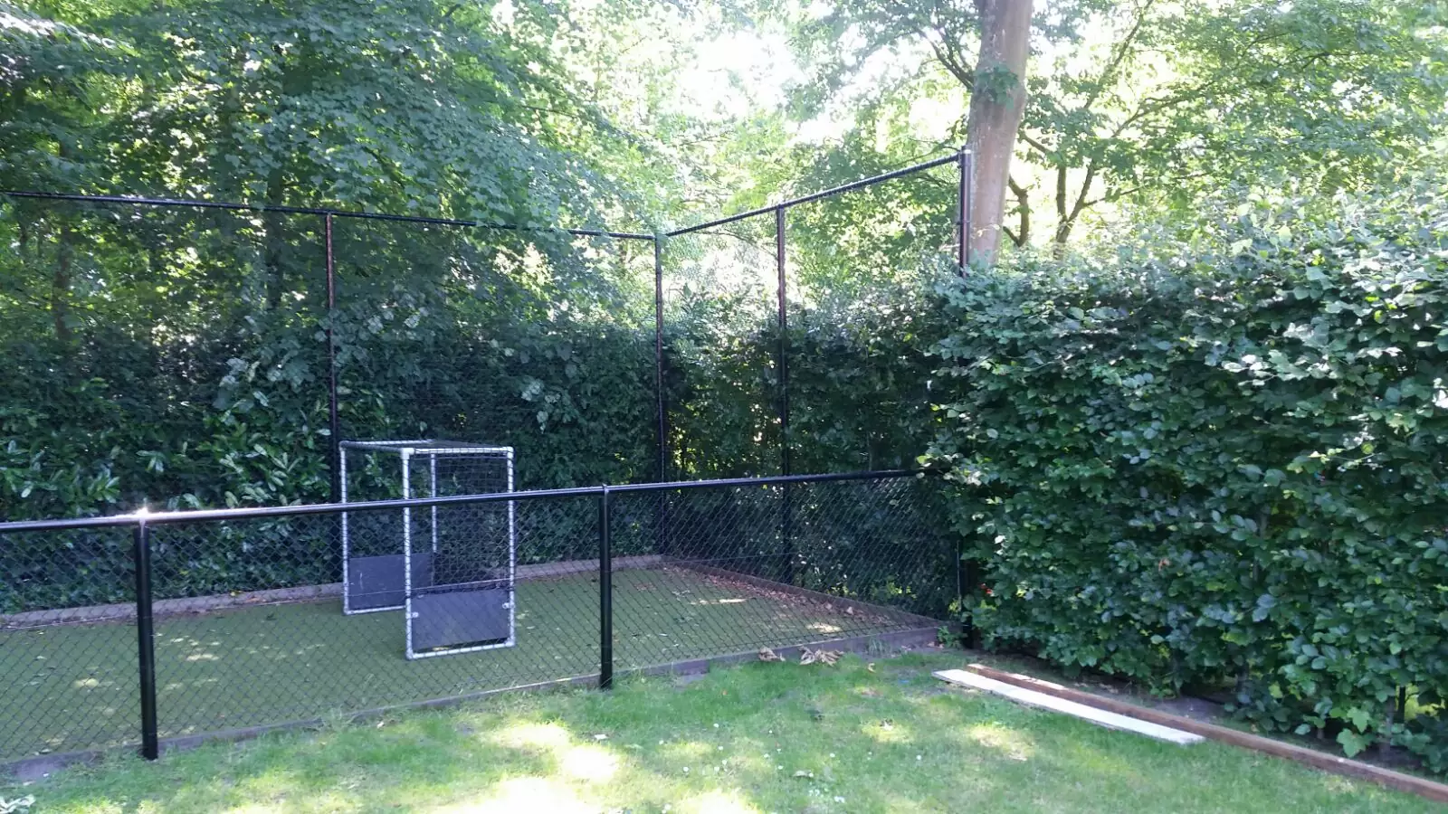 Professionele, geluidsarme ballenvanger inclusief interieur. Hoog hekwerk bij een speelveld, meestal langs een deel van het terrein.