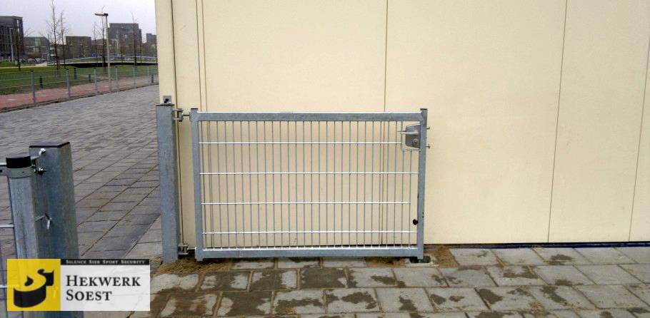 Deze standaard enkele draaipoort is gevuld met dubbelstaafmat. De poort is voorzien van een dag- en nachtslot met europrofiel cilinder en aluminium deurkruk.