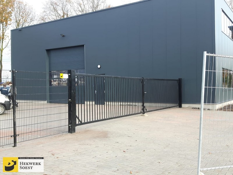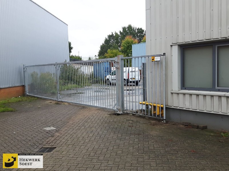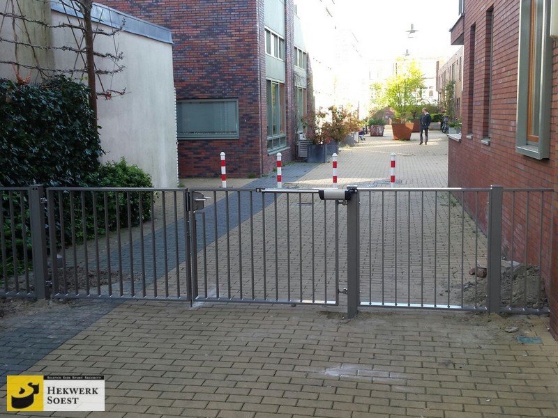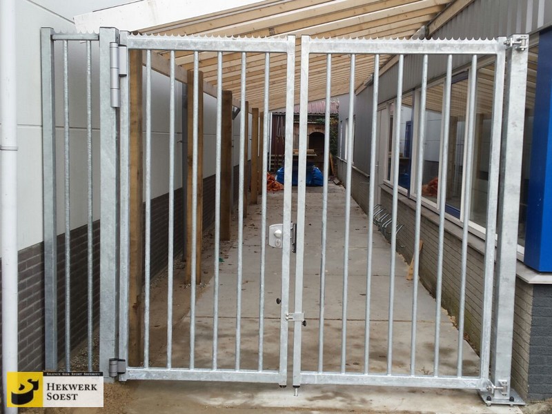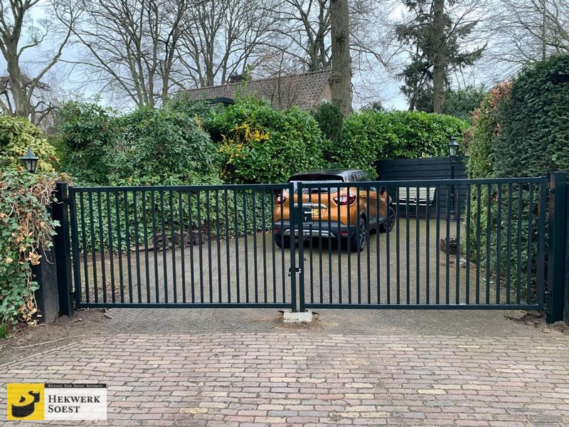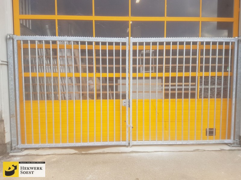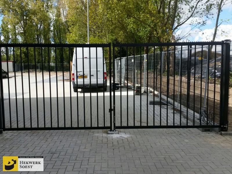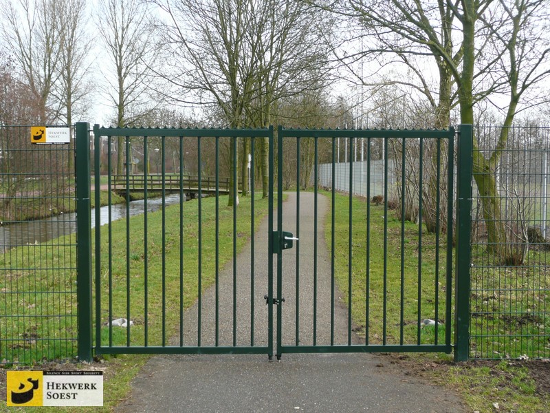 Deze standaard dubbele draaipoort is gevuld met standaard spijlen. De poort is voorzien van een dag- en nachtslot met europrofiel cilinder en aluminium deurkruk.
