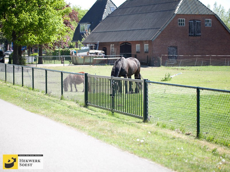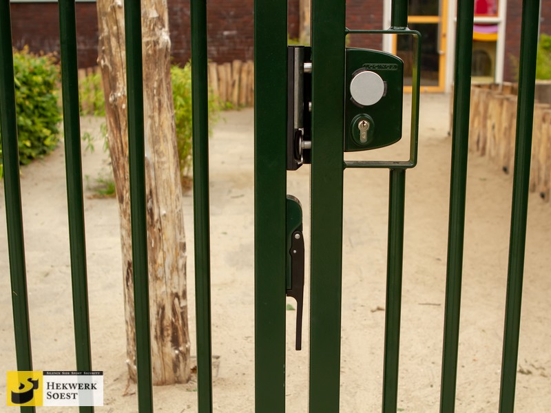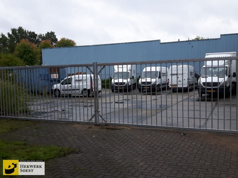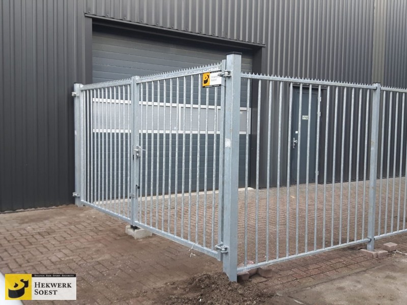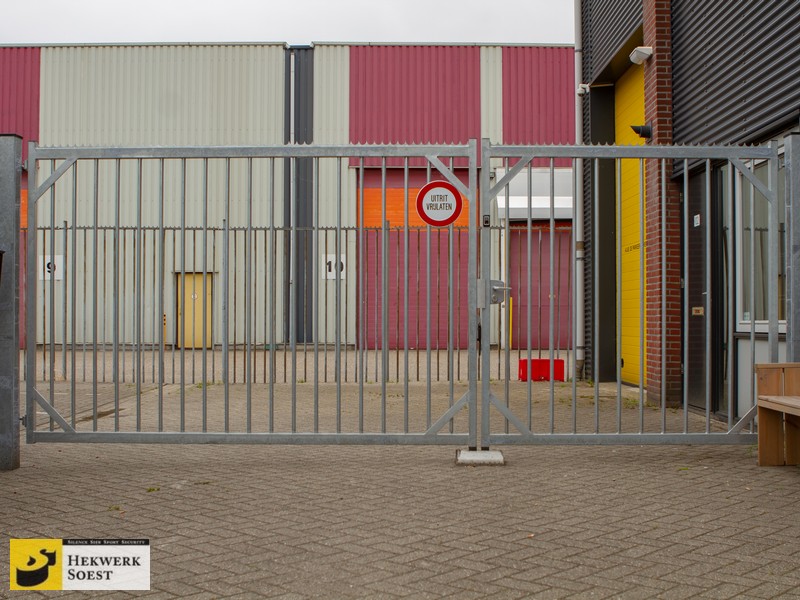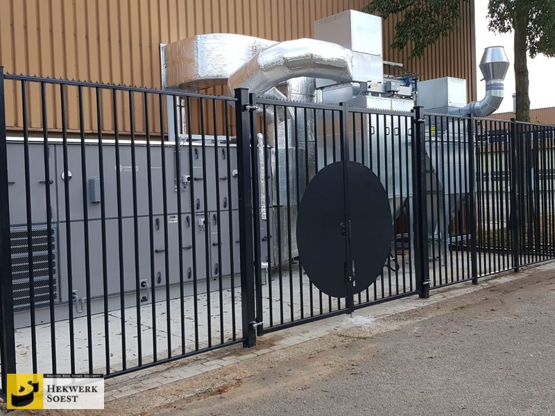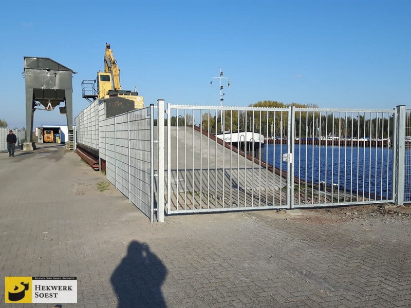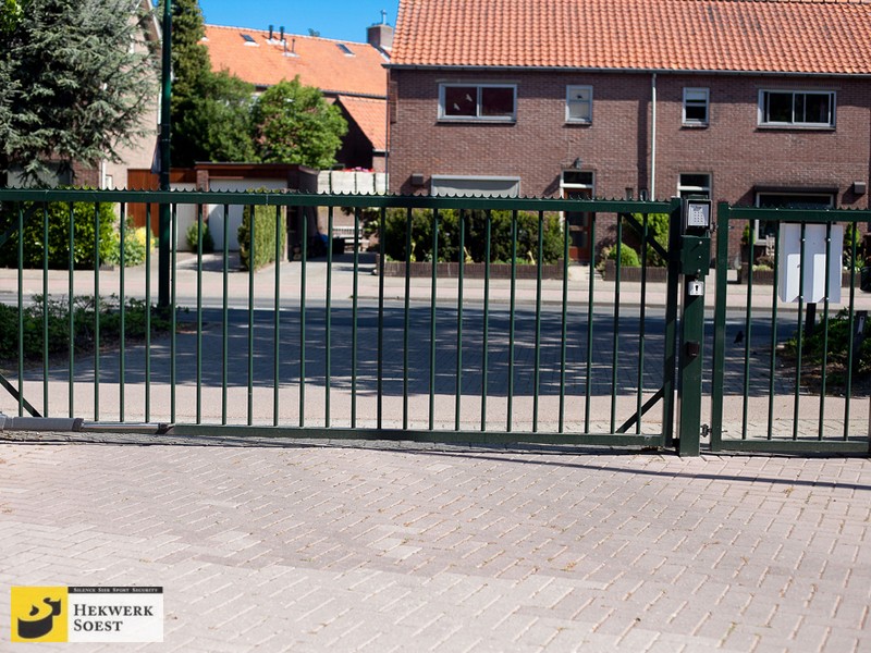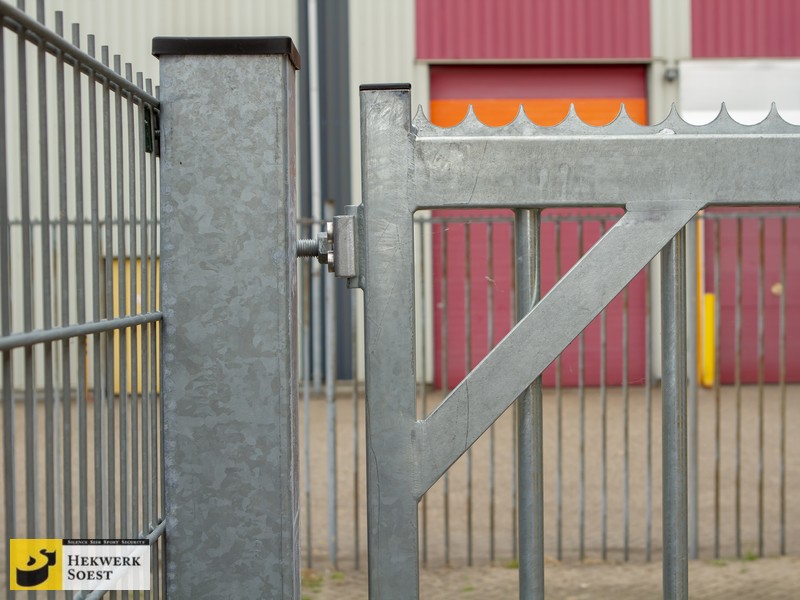 Deze standaard dubbele draaipoort is gevuld met standaard spijlen. De poort is voorzien van een dag- en nachtslot met europrofiel cilinder en aluminium deurkruk.