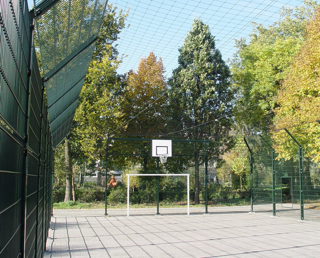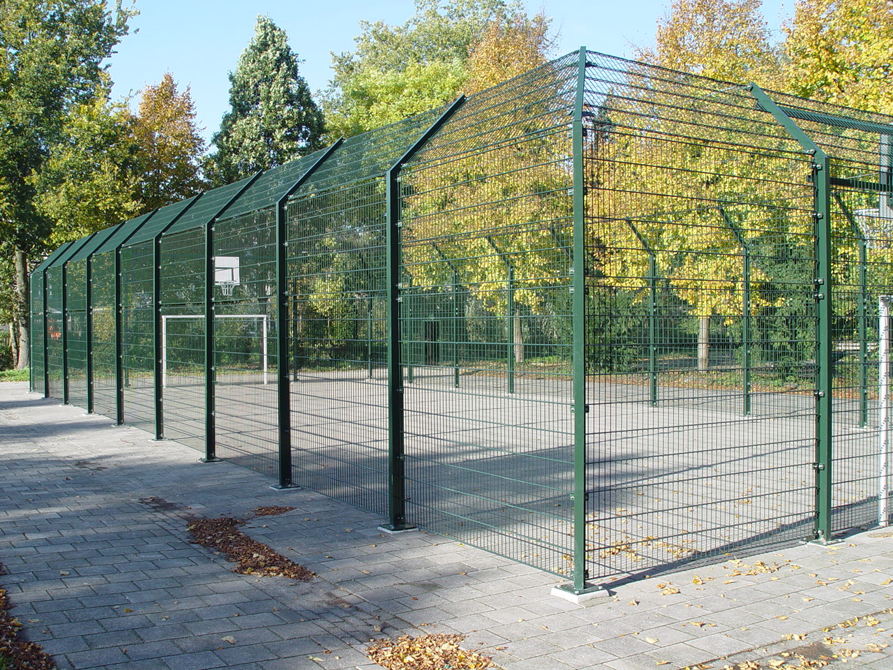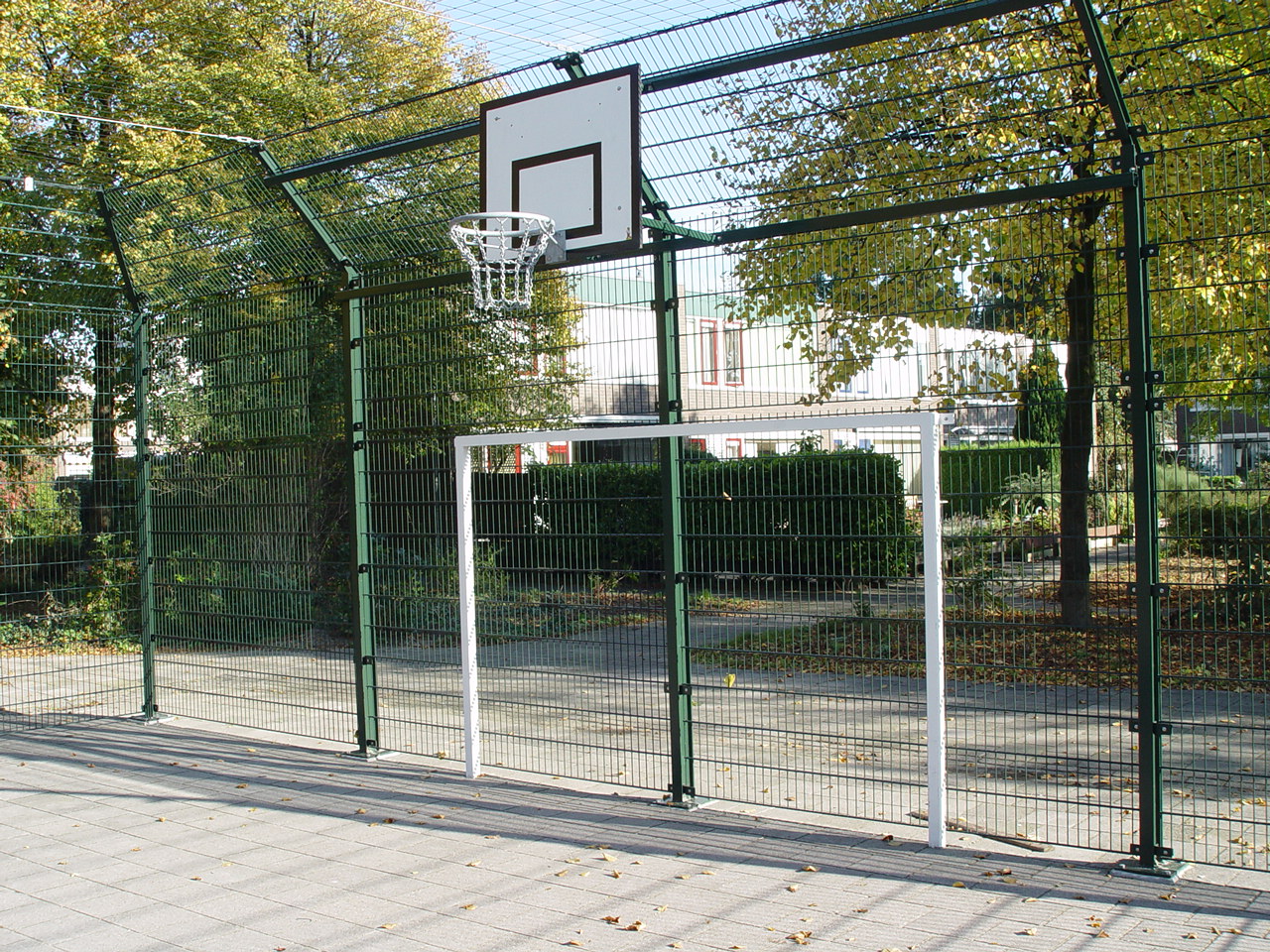 Professionele, geluidsarme ballenvangers inclusief interieur. Hoog hekwerk bij een speelveld, meestal langs een deel van het terrein.
