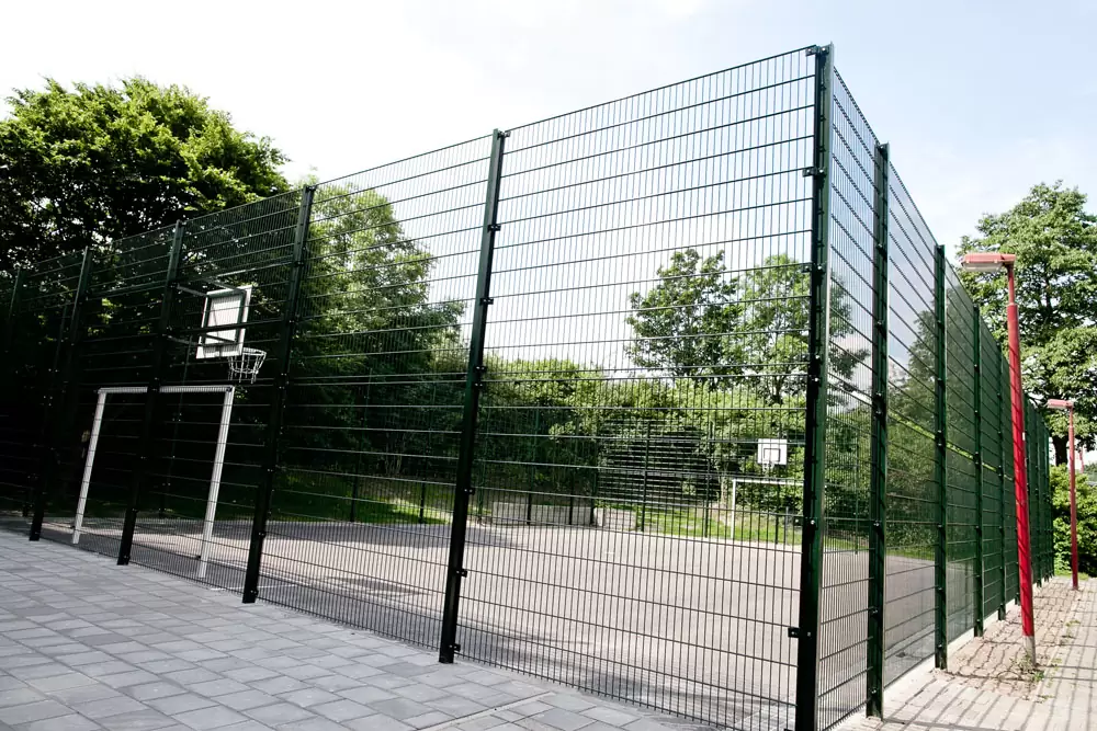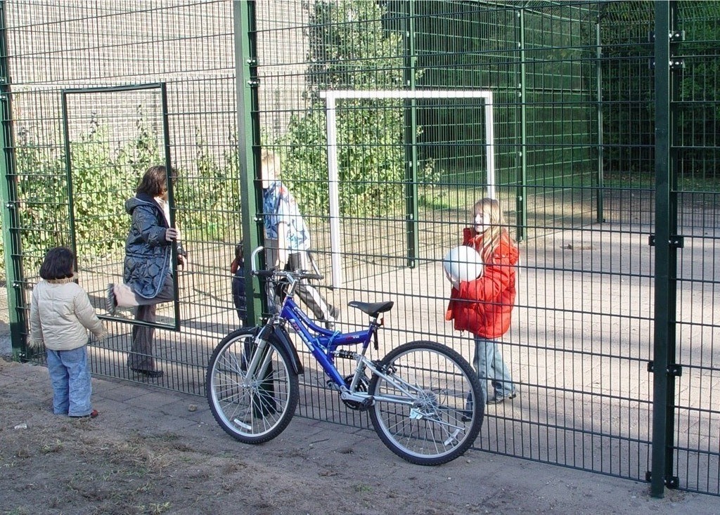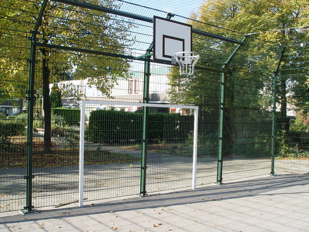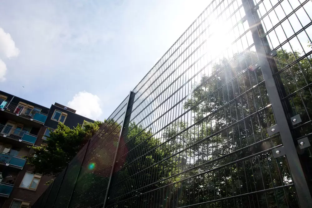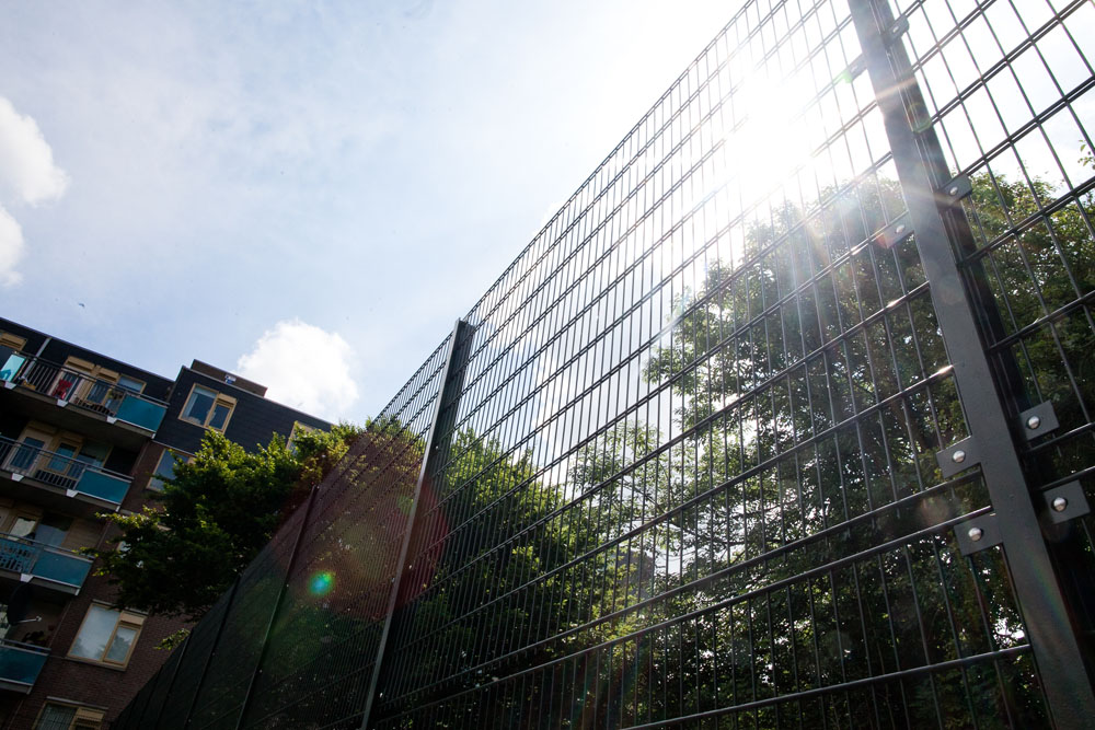Professionele, geluidsarme ballenvangers inclusief interieur. Hoog hekwerk bij een speelveld, meestal langs een deel van het terrein.