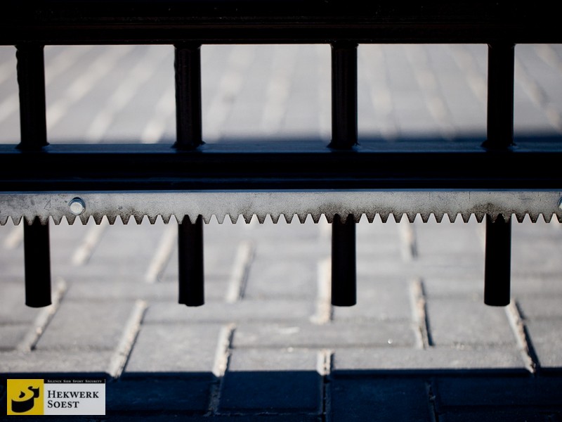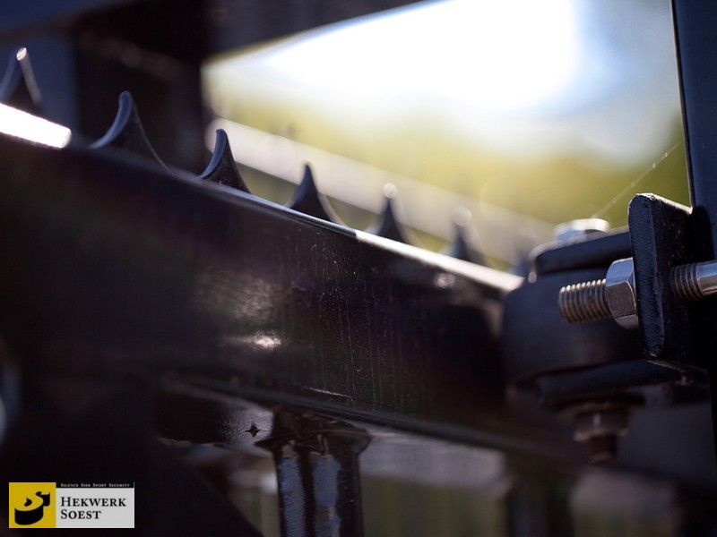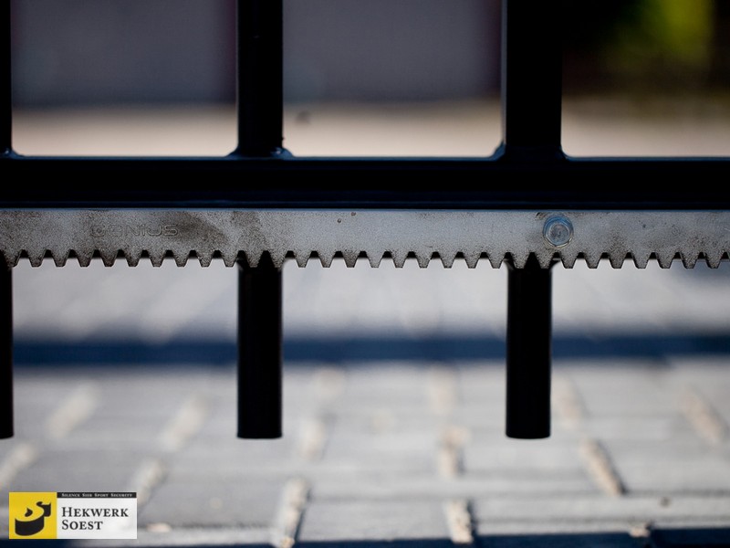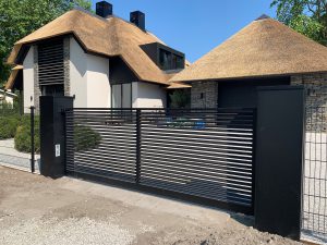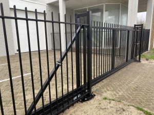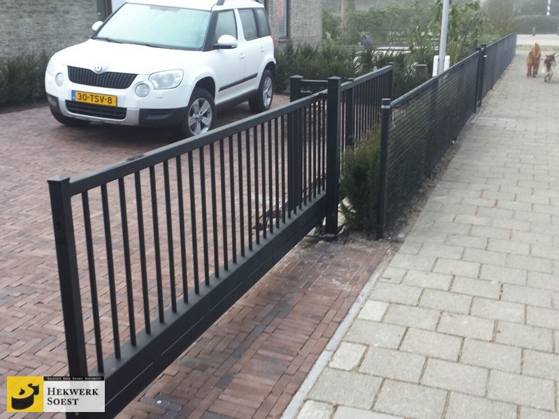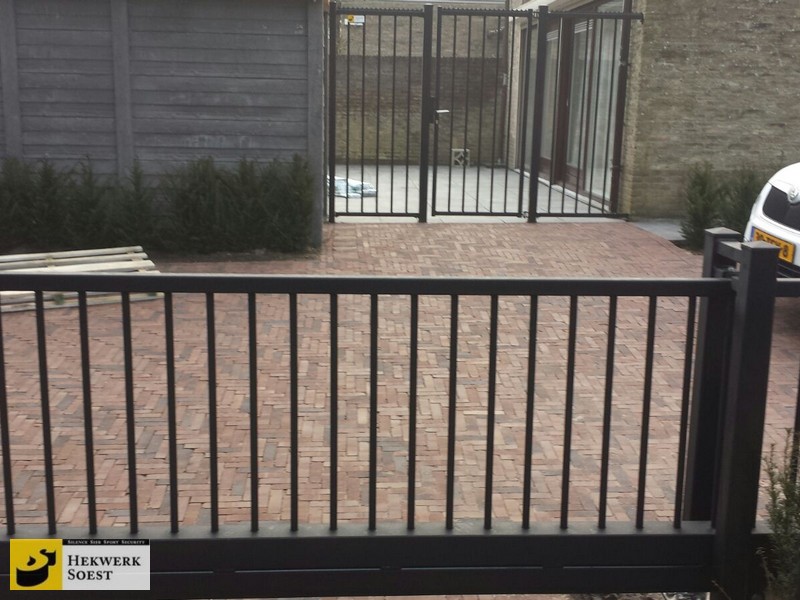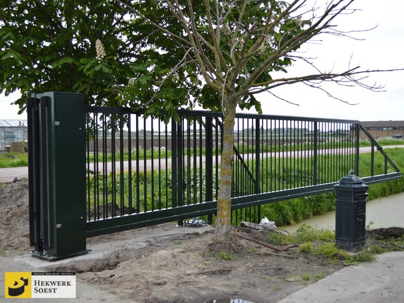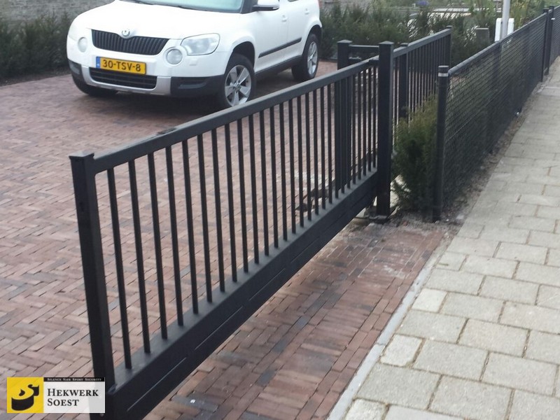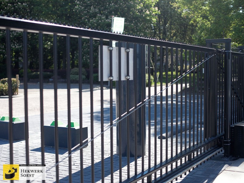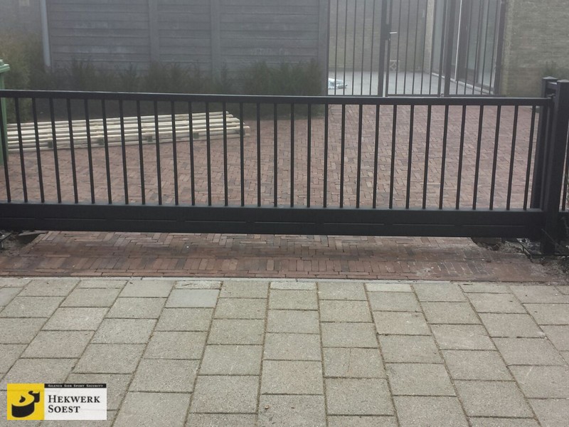 Stoere en robuuste schuifpoort met standaard spijlen, wat betekent dat de spijlen niet doorsteken aan de bovenkant. In diverse uitvoeringen mogelijk en daarom geschikt voor zowel bedrijven als particulieren.