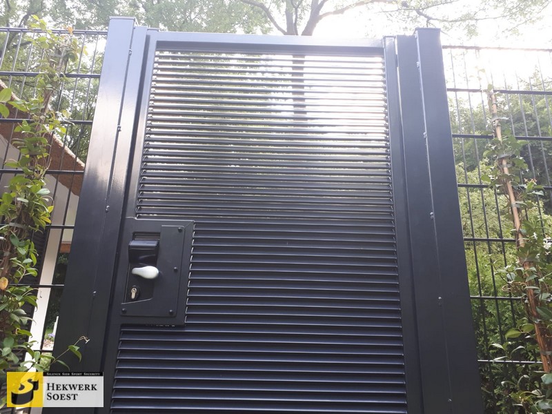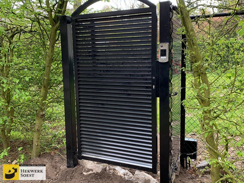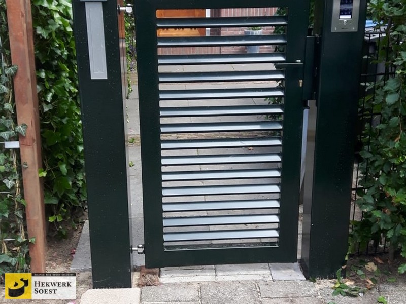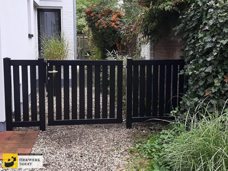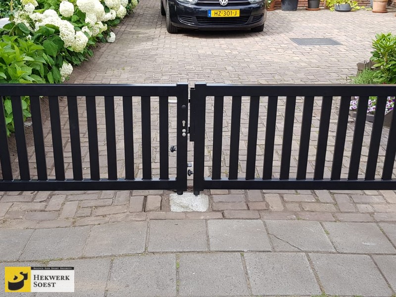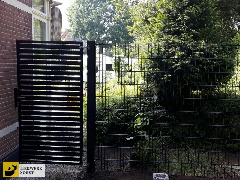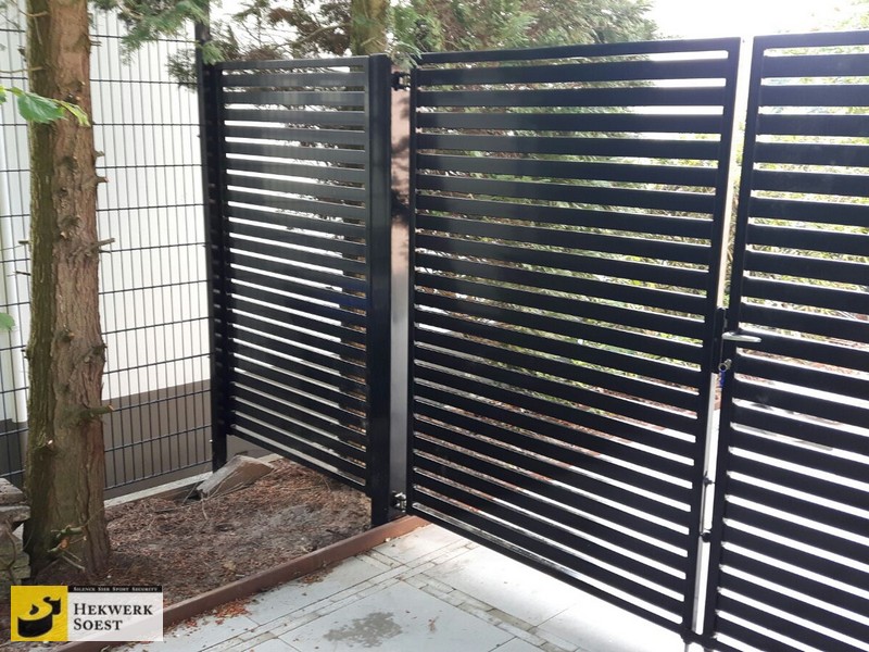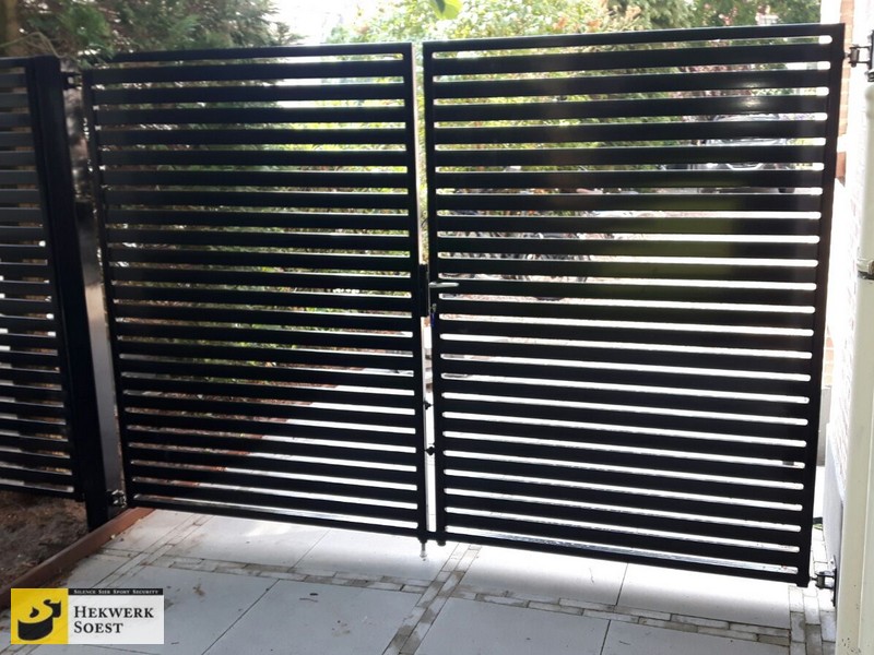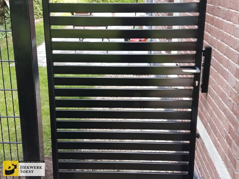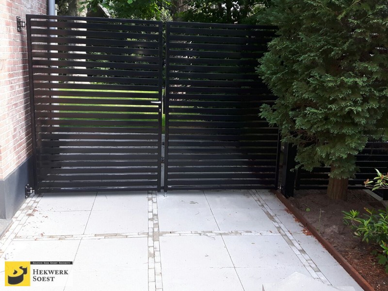 Deze sierpoorten met bijpassend hekwerk wordt gemaakt met lamellen. U bepaalt u uw eigen hoogte en breedte en hoe u de lamellen in het hekwerk wilt hebben. Dat kan horizontaal, verticaal, schuin of een combinatie hiervan. Ook de schuinte waarmee de lamellen worden gelast in het hekwerk kunt u bepalen. Zo kunnen ze recht, maar ook schuin erin. Wel of geen doorkijk? Ook kunt u kiezen welke deurgreep u wilt.