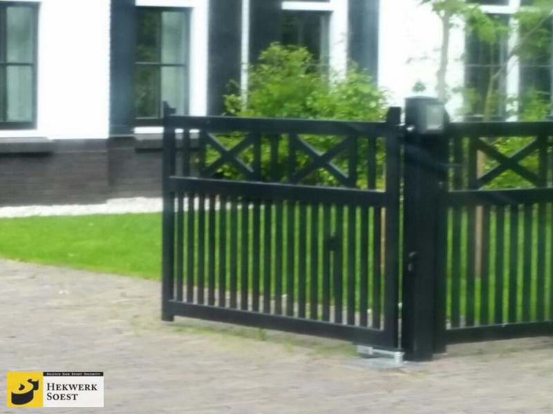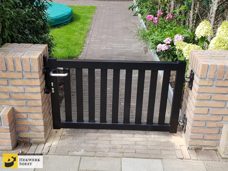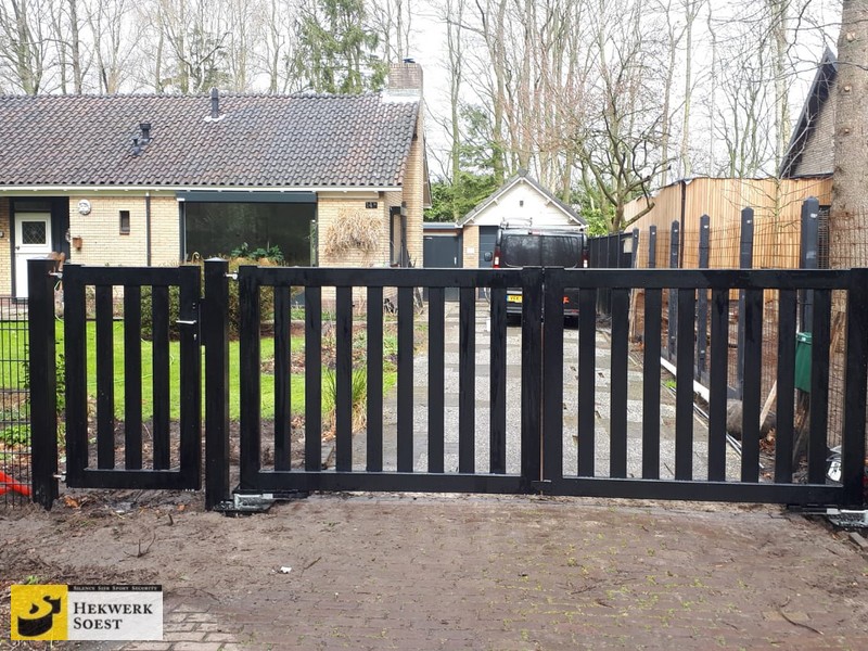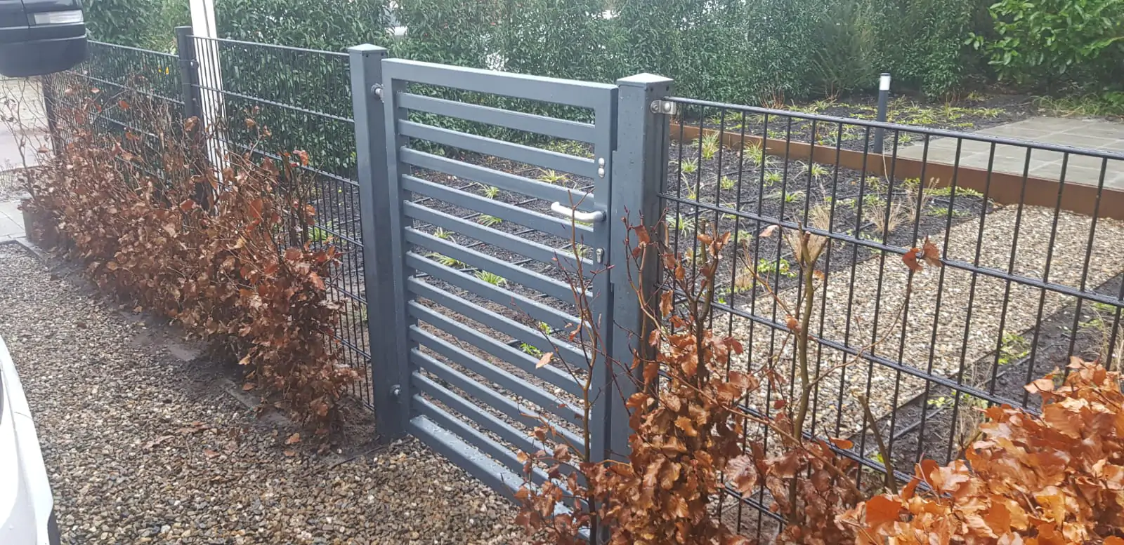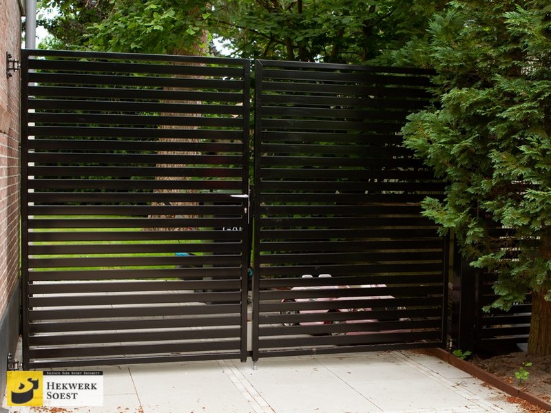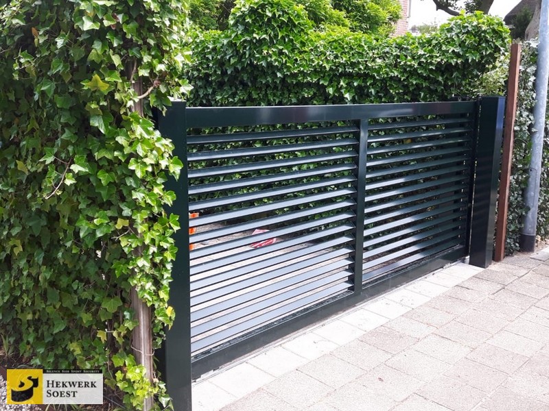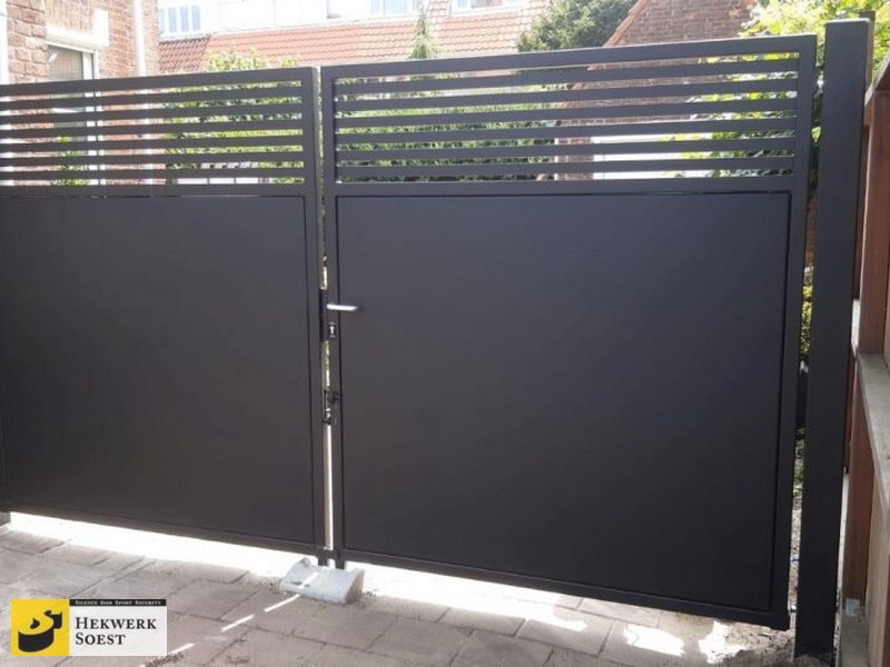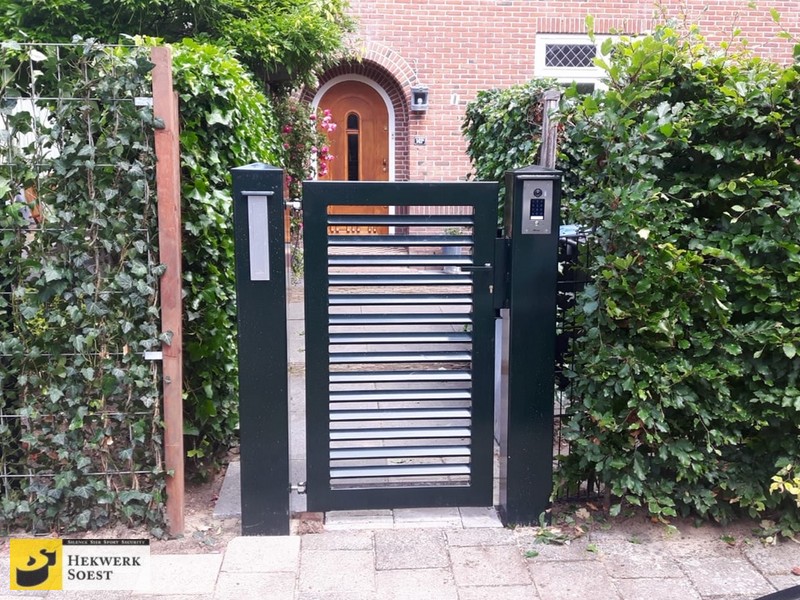 Deze sierpoorten met bijpassend hekwerk wordt gemaakt met lamellen. U bepaalt u uw eigen hoogte en breedte en hoe u de lamellen in het hekwerk wilt hebben. Dat kan horizontaal, verticaal, schuin of een combinatie hiervan. Ook de schuinte waarmee de lamellen worden gelast in het hekwerk kunt u bepalen. Zo kunnen ze recht, maar ook schuin erin. Wel of geen doorkijk? Ook kunt u kiezen welke deurgreep u wilt.