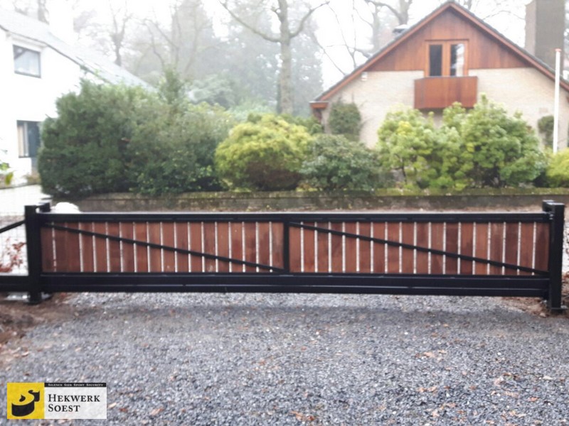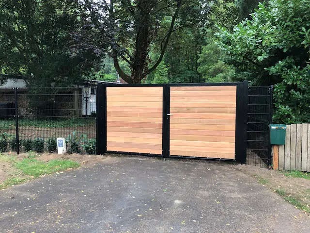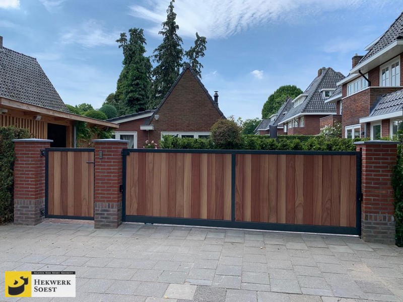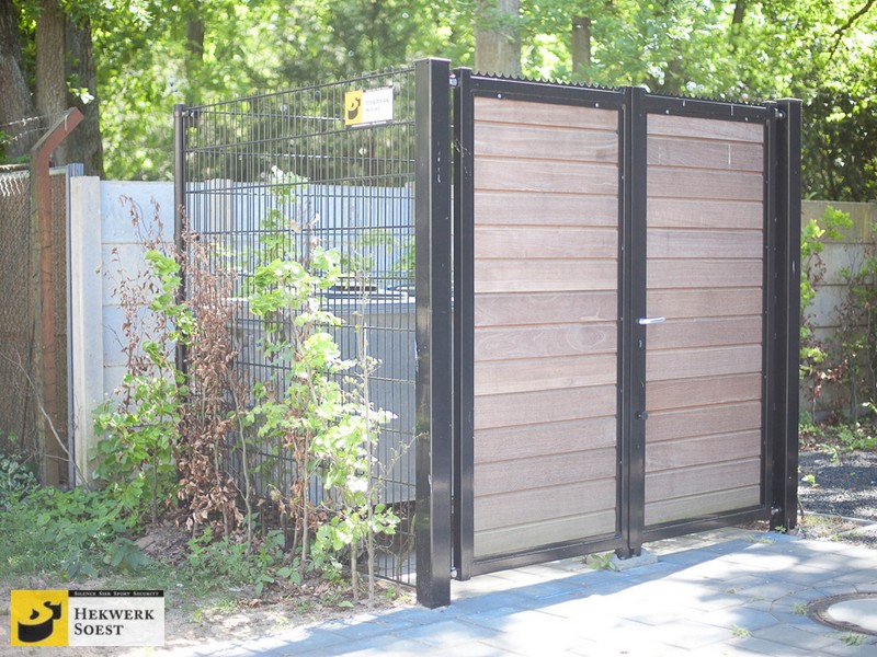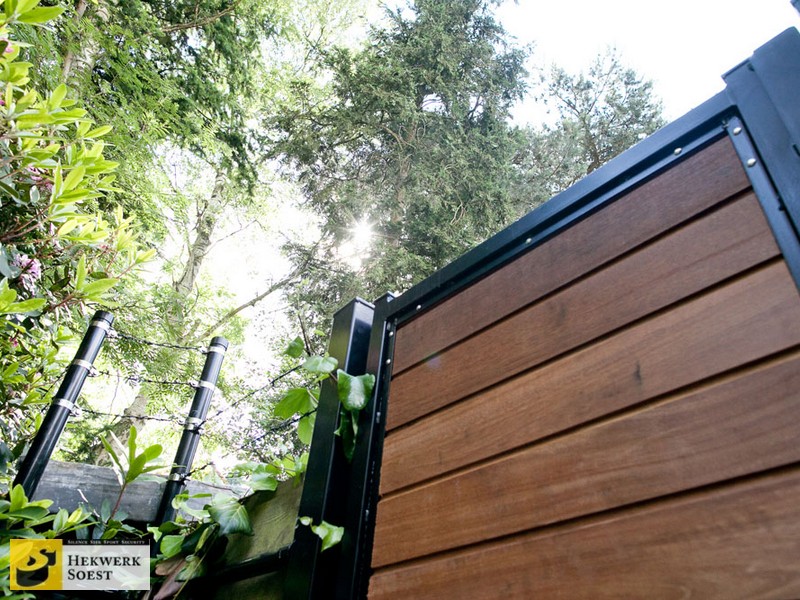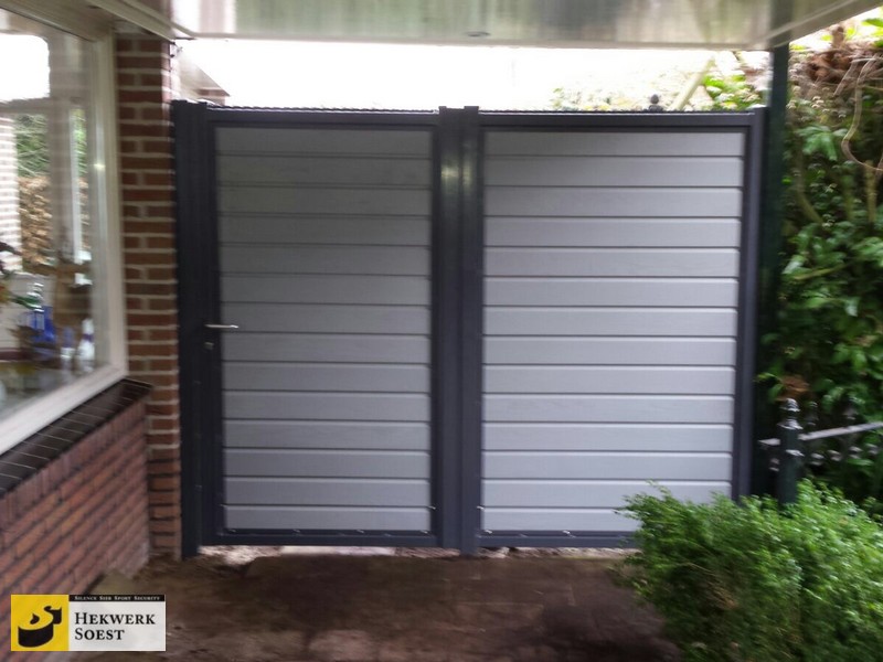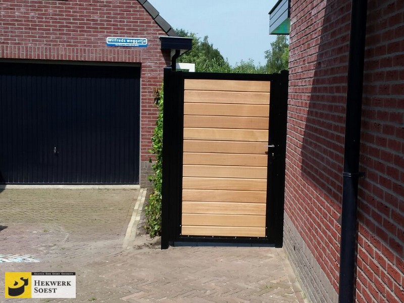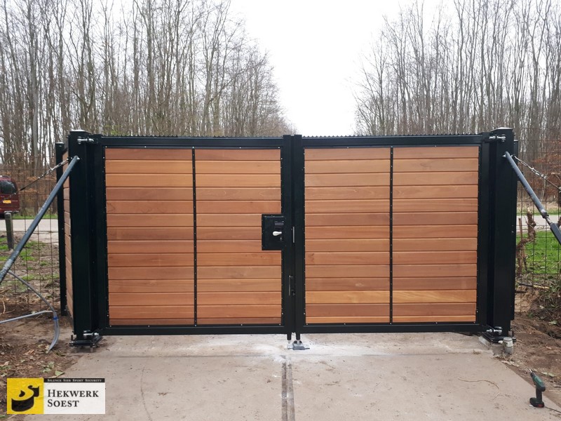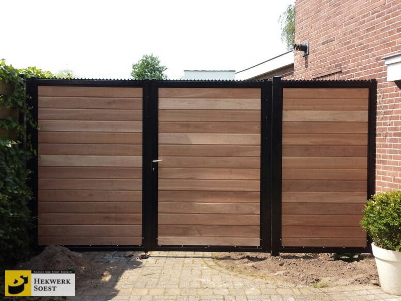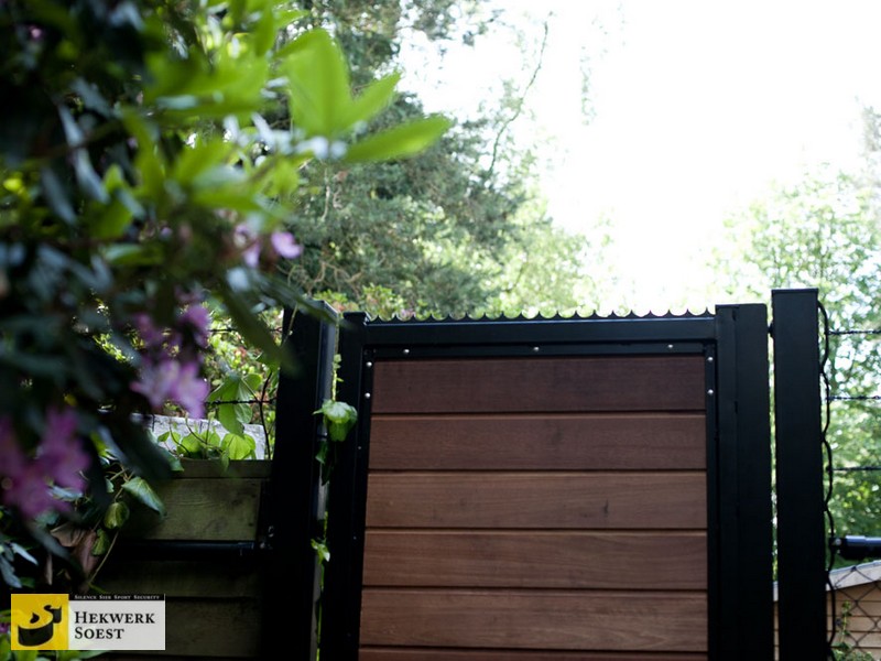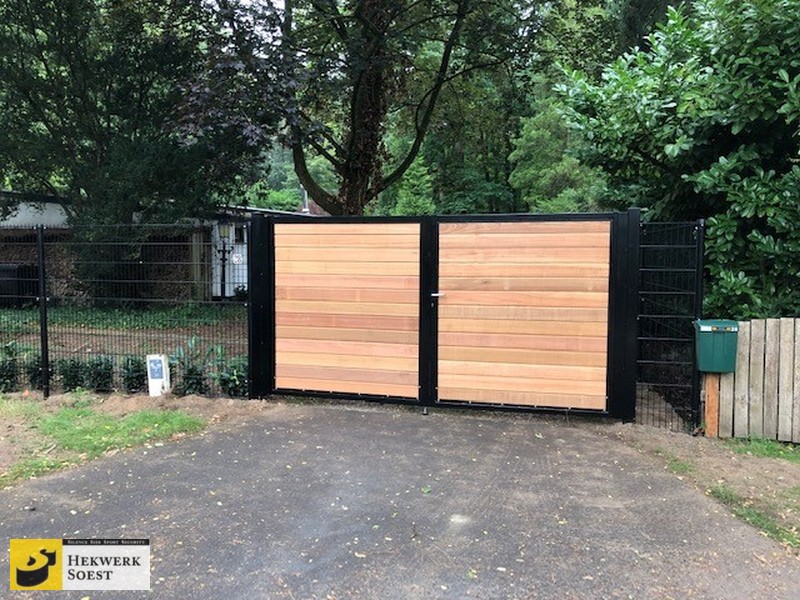Bij deze sierpoorten is de basis een metalen frame met metalen poortpalen. En dit geheel word gevuld met een houtsoort naar keuze.  U bepaalt uw eigen hoogte en breedte. Ook kunt u kiezen welke deurgreep u wilt. De keuze is groot en maakt alles mogelijk.
