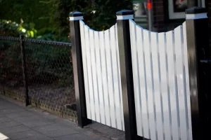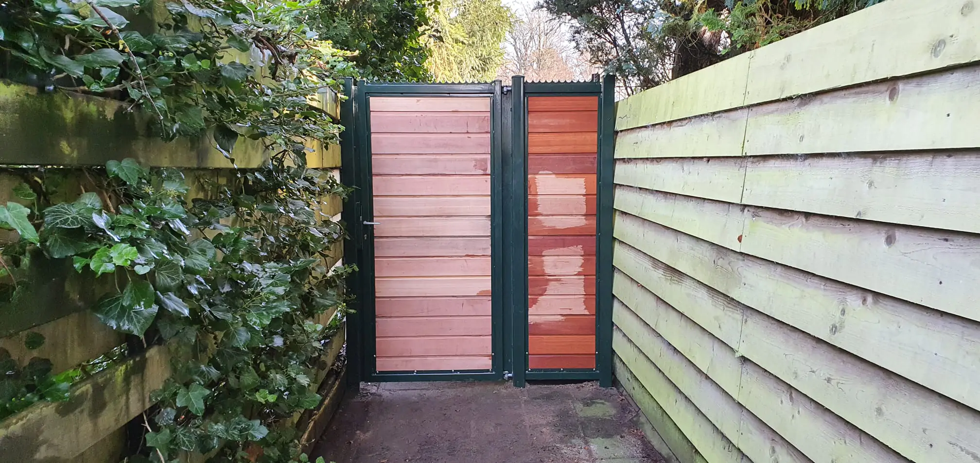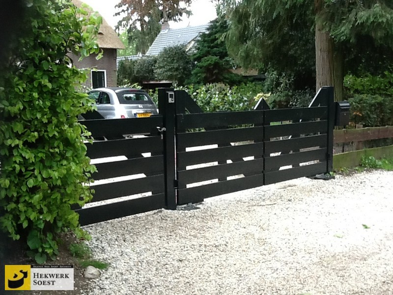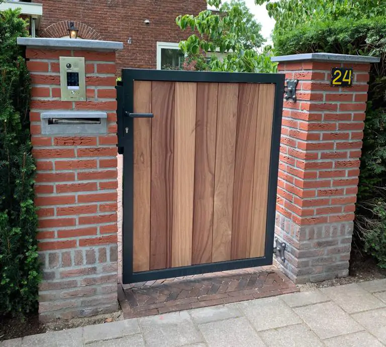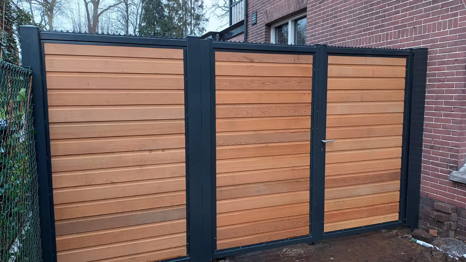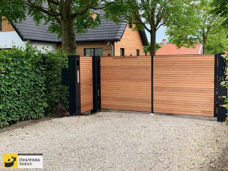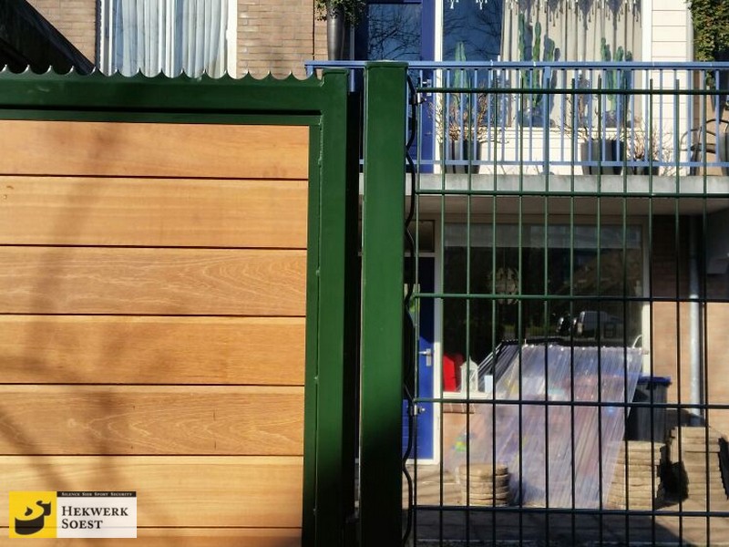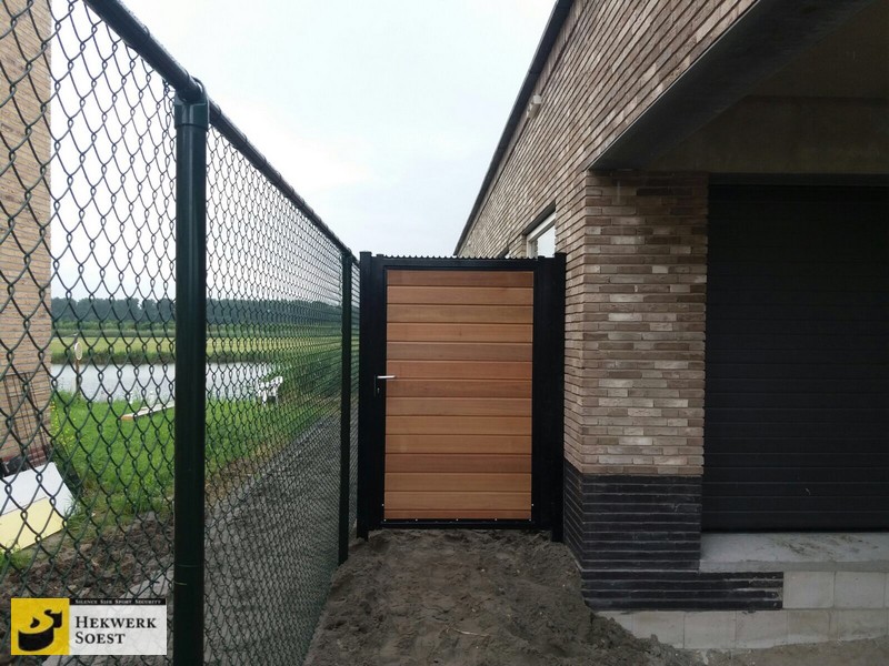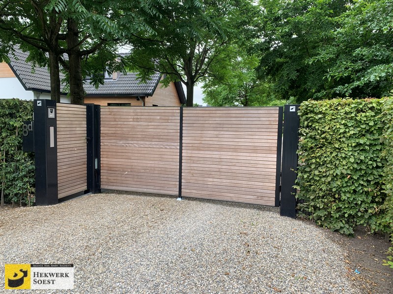 Bij deze sierpoorten is de basis een metalen frame met metalen poortpalen. En dit geheel word gevuld met een houtsoort naar keuze.  U bepaalt uw eigen hoogte en breedte. Ook kunt u kiezen welke deurgreep u wilt. De keuze is groot en maakt alles mogelijk.