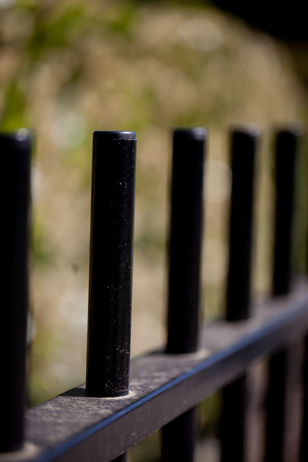 Standaard spijlenhekwerk met ronde spijlen. Bij dit hekwerk steken de spijlen niet door de bovenligger.