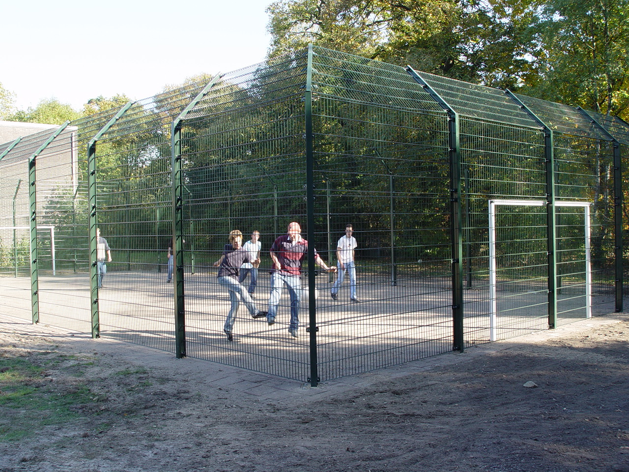 Professionele, geluidsarme voetbalkooien (of pannakooien genoemd) inclusief interieur. Hoog omsloten hekwerk rondom een speelveld, indien gewenst afgedekt met een daknet.